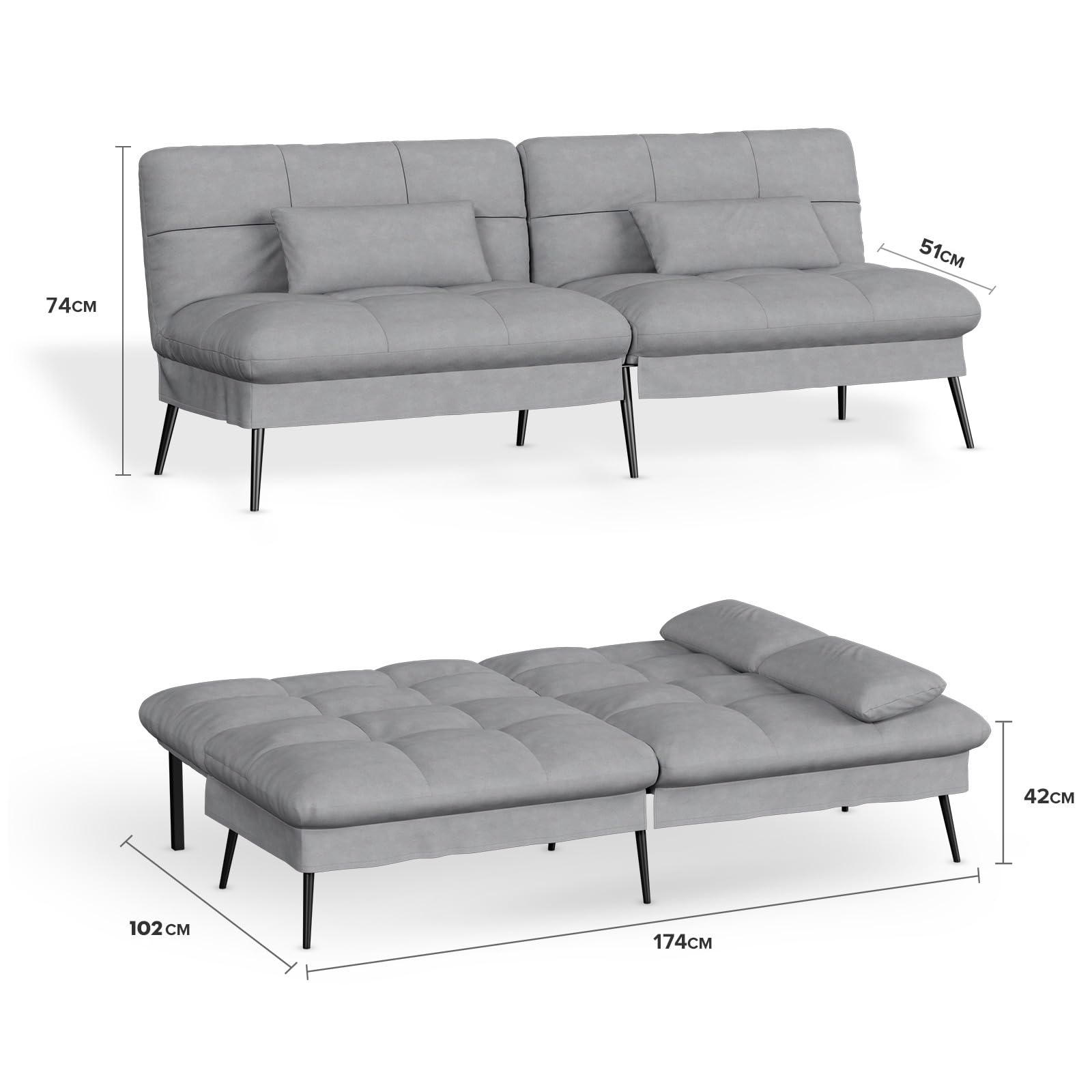3-Seater Fabric Sofa Bed – Adjustable Backrest with 5 Recline Positions – Grey