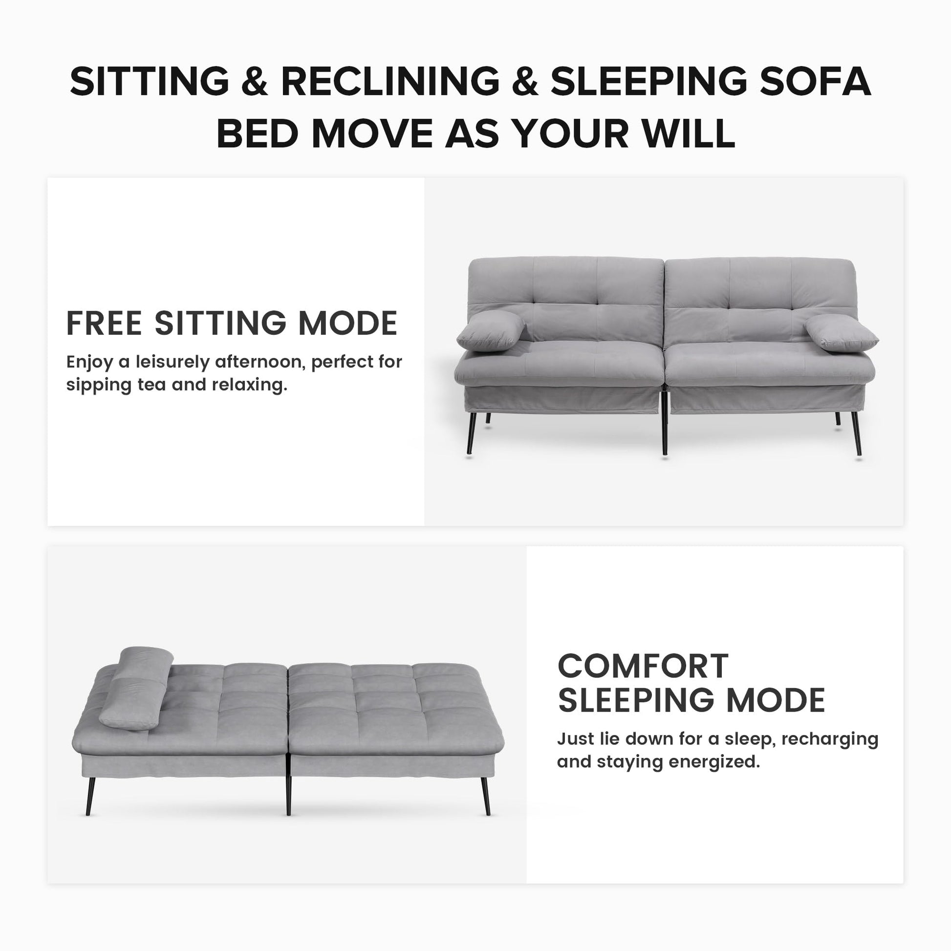 The adjustable backrest offers five recline positions, allowing you to sit upright, lounge, or lie flat with ease. Upholstered in soft, durable grey fabric, it complements a wide range of interior styles while providing reliable comfort and support.