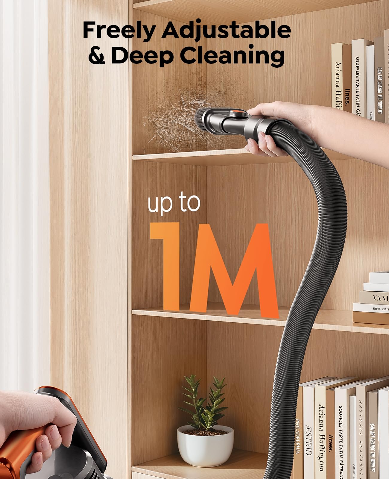 Versatile Cleaning Kit: 8-in-1 attachments, including a 1m extendable hose, 2-in-1 flat tool, and precision crevice brush, for thorough cleaning of corners, stairs, sofas, and window sills.