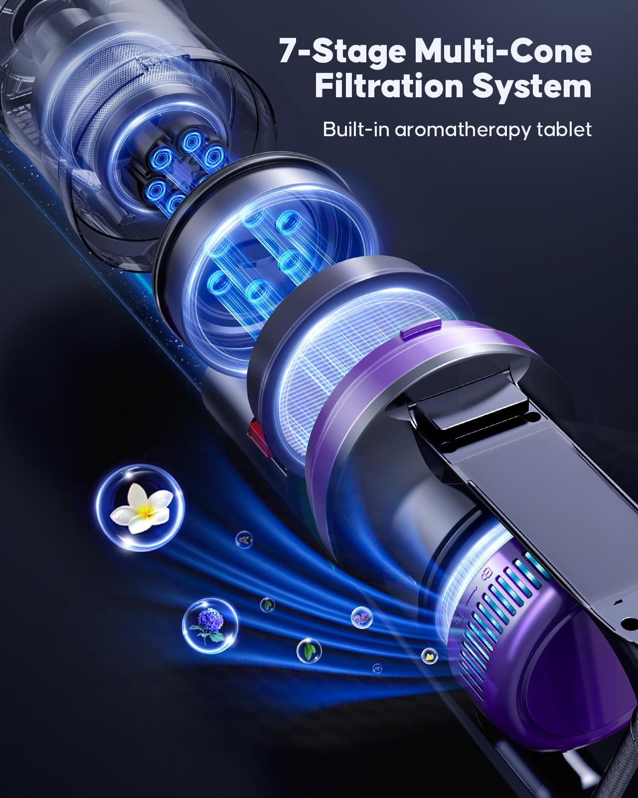 Equipped with a 7-stage HEPA filtration system, it captures up to 99.99% of fine dust and allergens, ensuring cleaner air as you vacuum. For added freshness, built-in fragrance discs release a light scent during cleaning.