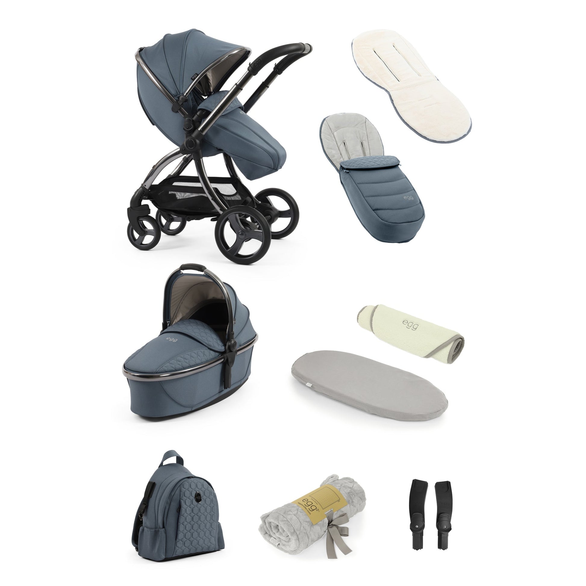The egg3 9 Piece Snuggle Bundle in Topaz signature soft-touch marl fabrics dress the classic egg3® gunmetal chassis, while the black hand-stitched handle and bumper bar adds depth of contrast to complete the whole aesthetic.