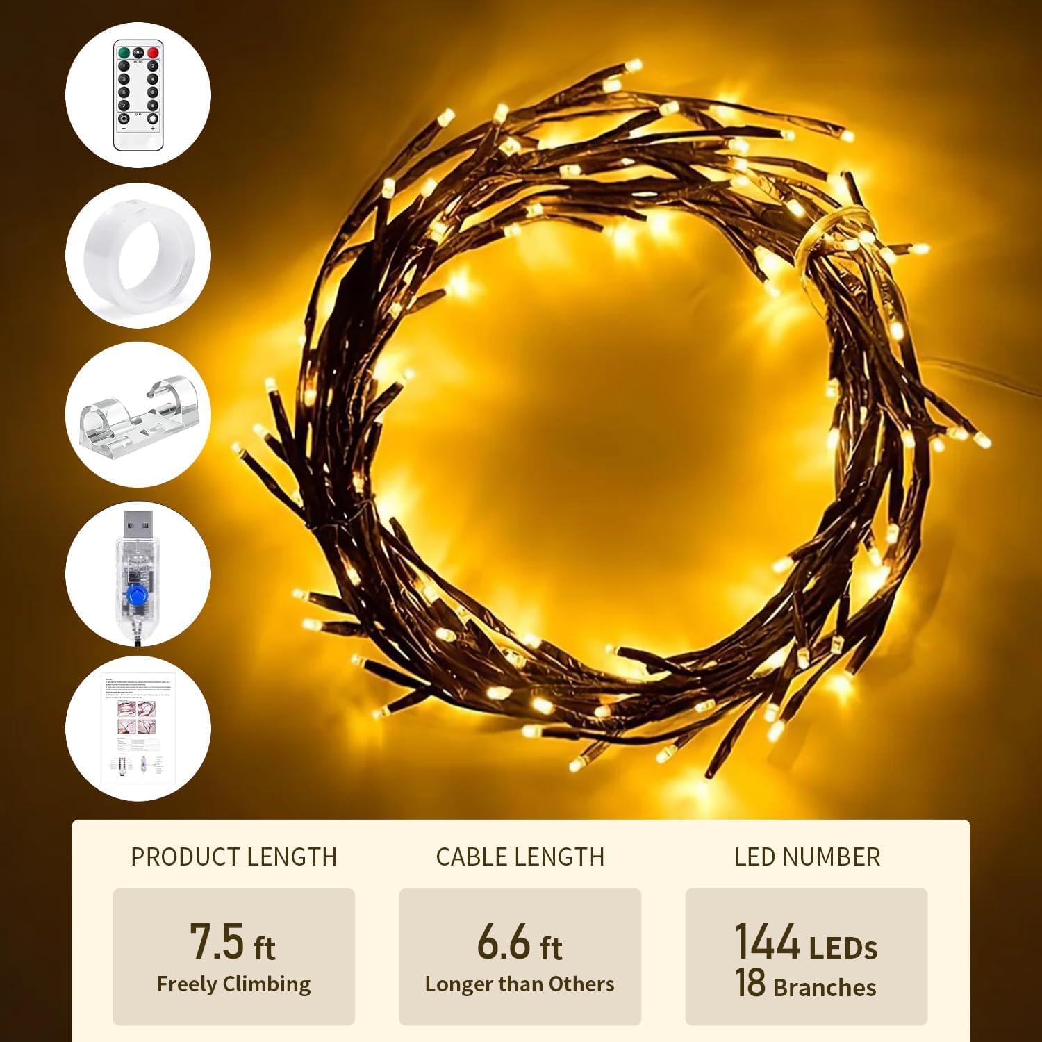Willow Vine Twig Lights – 2-Pack | 7.5FT Bendable Branches | 144 Warm White LEDs | USB Powered with Remote & 8 Modes