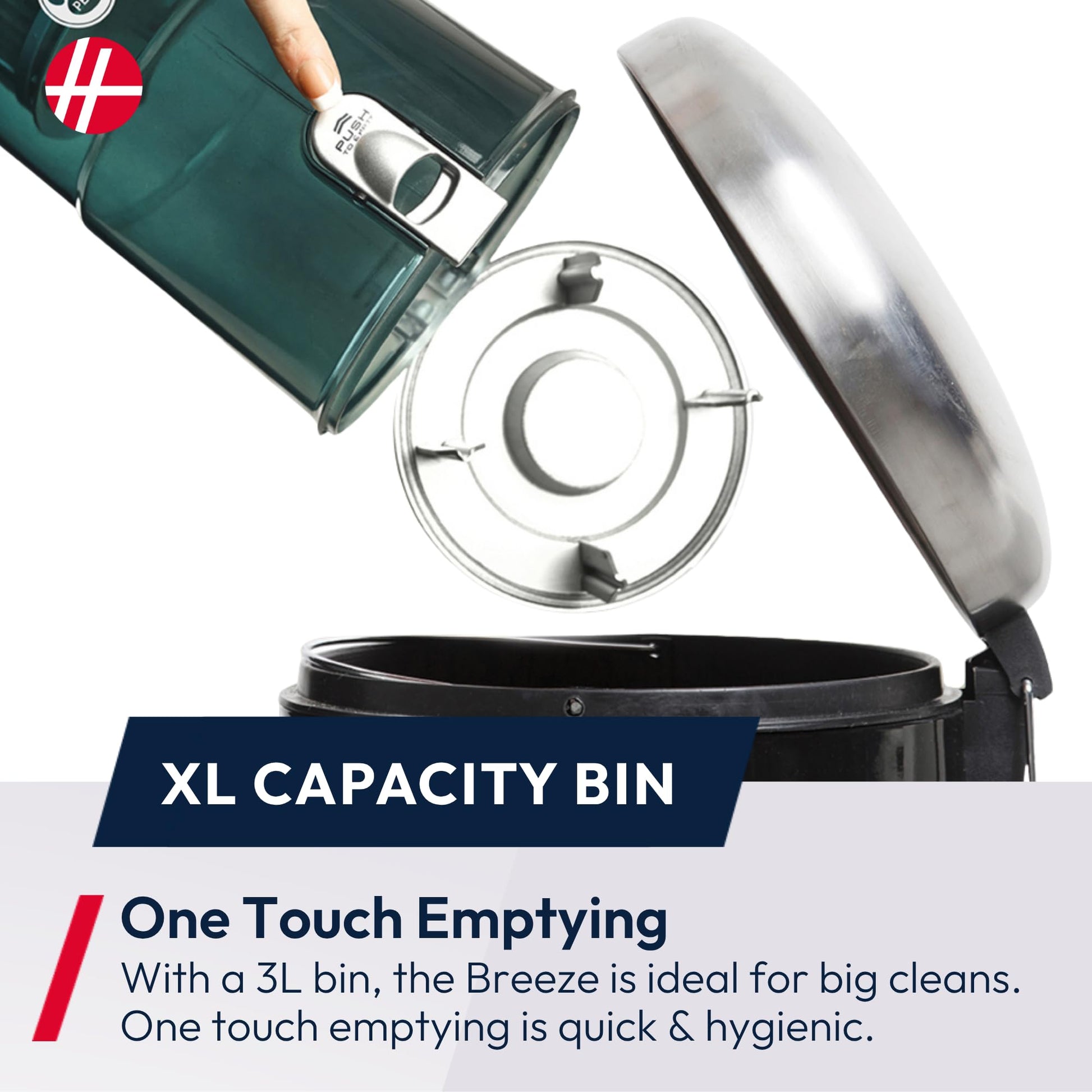 Hygienic 3L Dust Bin: Large bagless container with one-touch emptying keeps hands dust-free and simplifies maintenance.