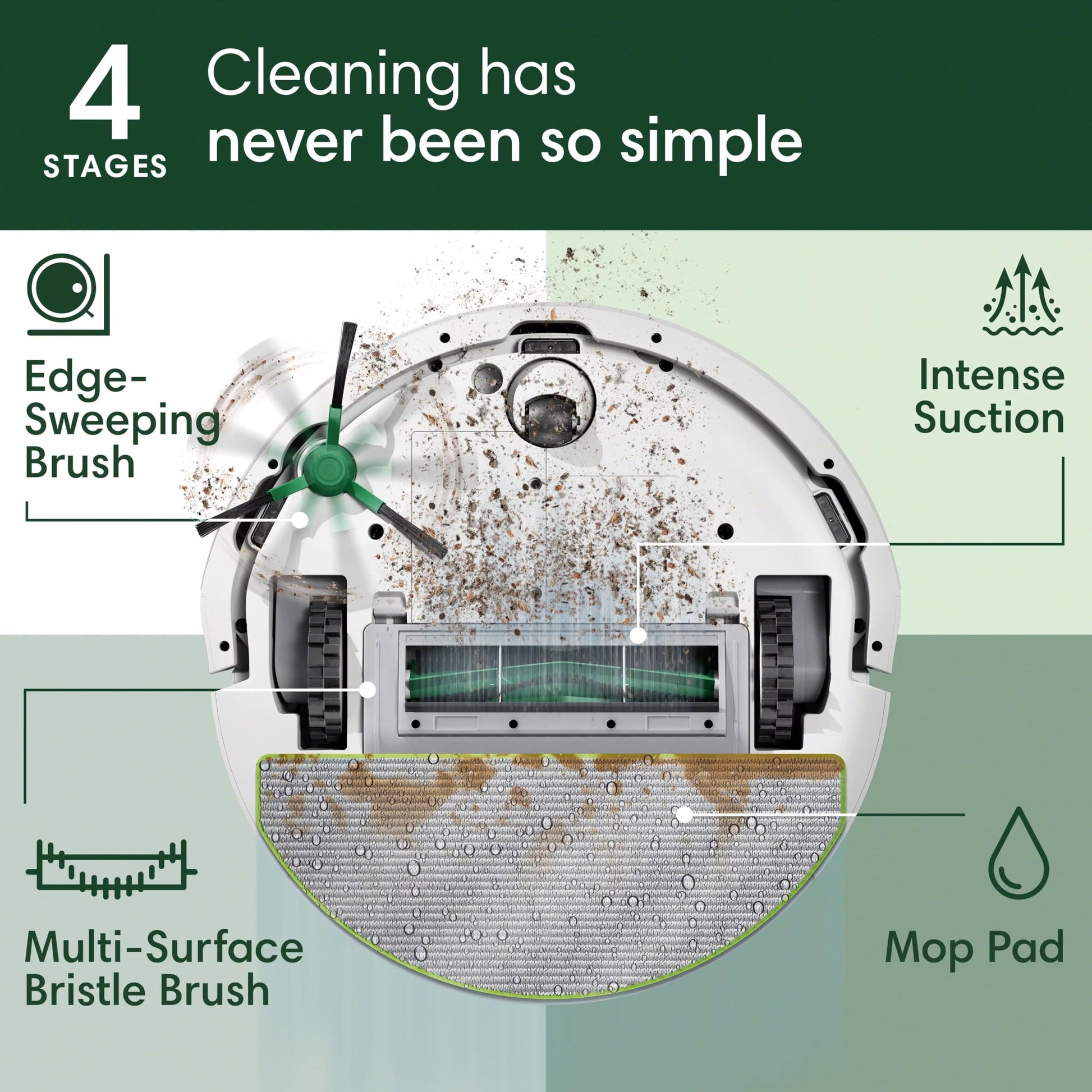 • 4-Stage Cleaning System: Powerful suction lifts dirt and dust, while the Multi-Surface bristle brush and Edge-Sweeping brush reach corners and edges. The microfiber mop pad leaves floors polished and spotless.
