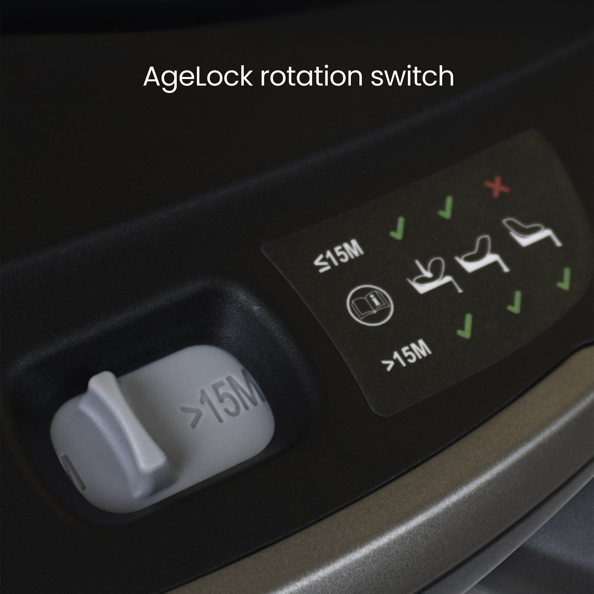 - AgeLock rotation switch ensures rear-facing travel for as long as possible