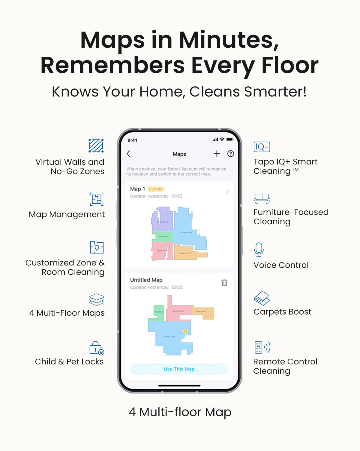 Tapo IQ smart technology allows furniture-focused cleaning, anti-drop protection, self-planned routes, multi-level suction, carpet detection, and automatic recharge and resume. Customize cleaning with virtual No-Go Zones, remote control, and multi-floor mapping, creating a tailored cleaning experience for every room.